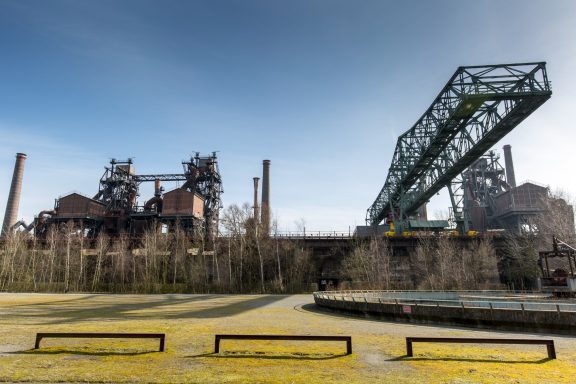 The Landschaftspark Duisburg-Nord is a public park in the German city of Duisburg. The centerpiece of the park is the ruins of a blast furnace complex that was shut down in 1985.